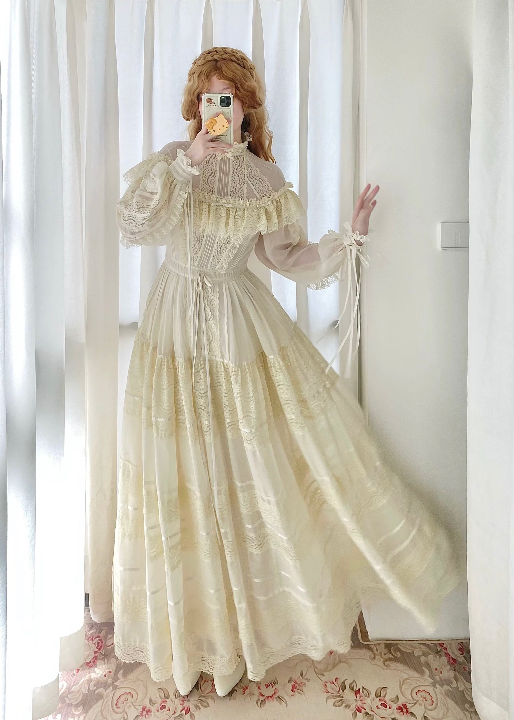 👗This dress is crafted with intricate workmanship, taking a long time to complete. The hem features a combination of lace and bias strips, made from soft cotton gauze. The ruffled sleeves beautifully cover the shoulders.
