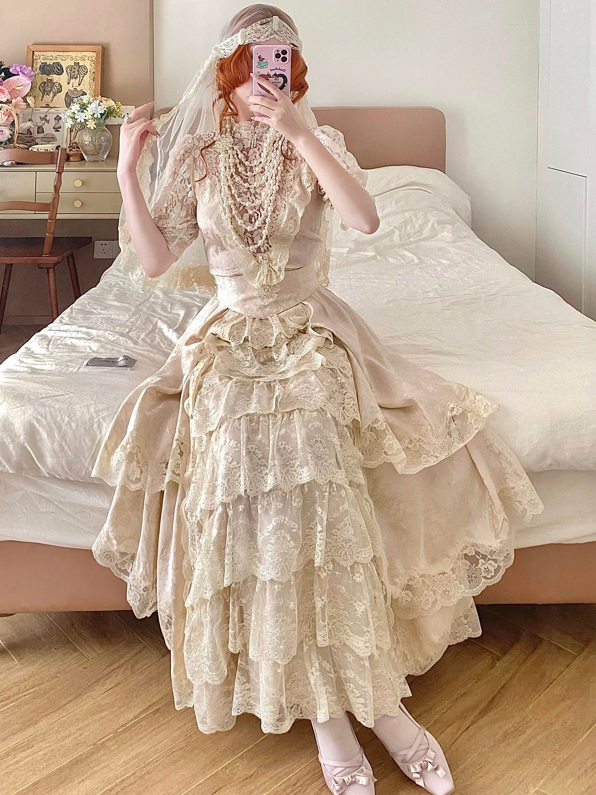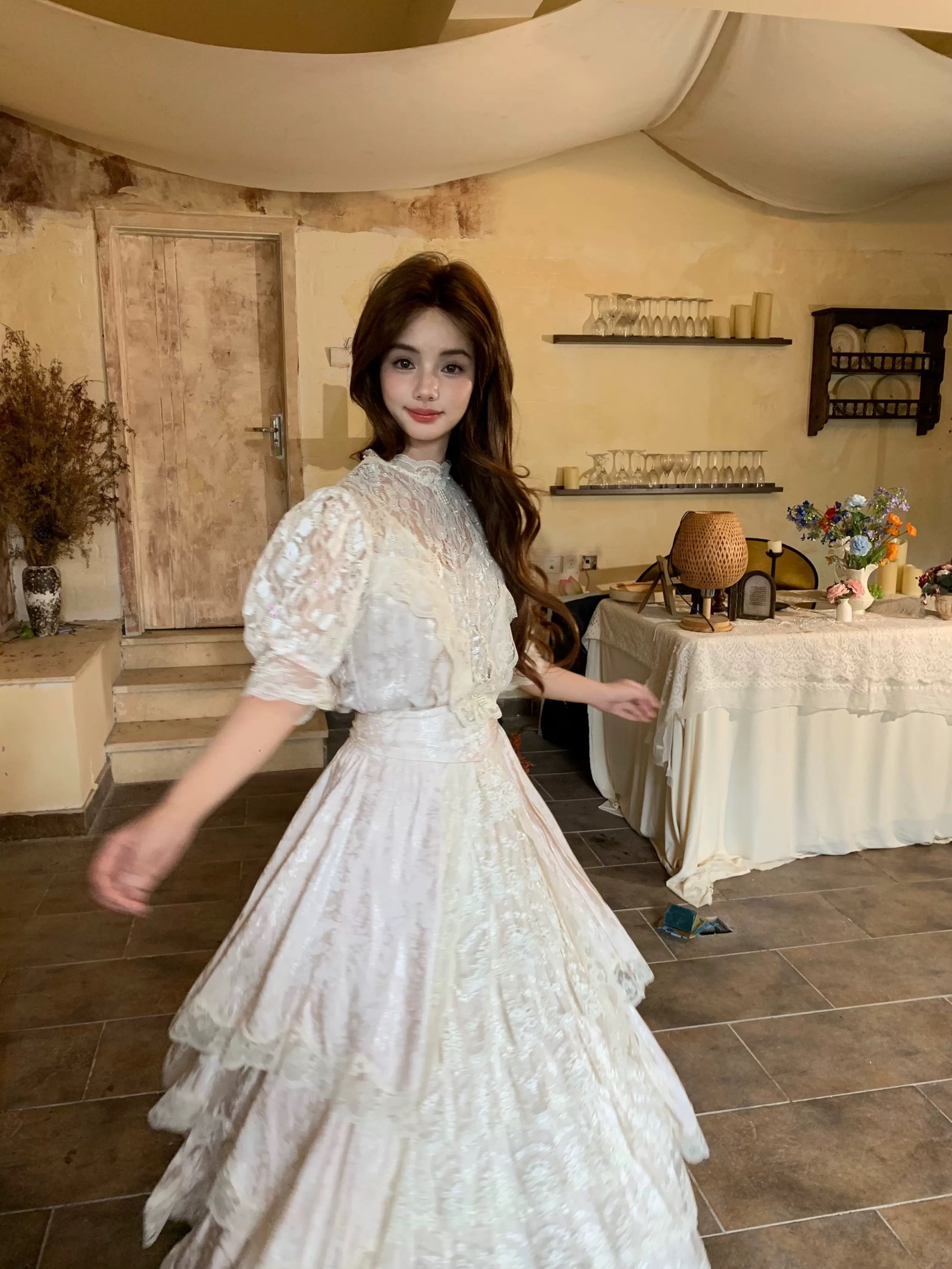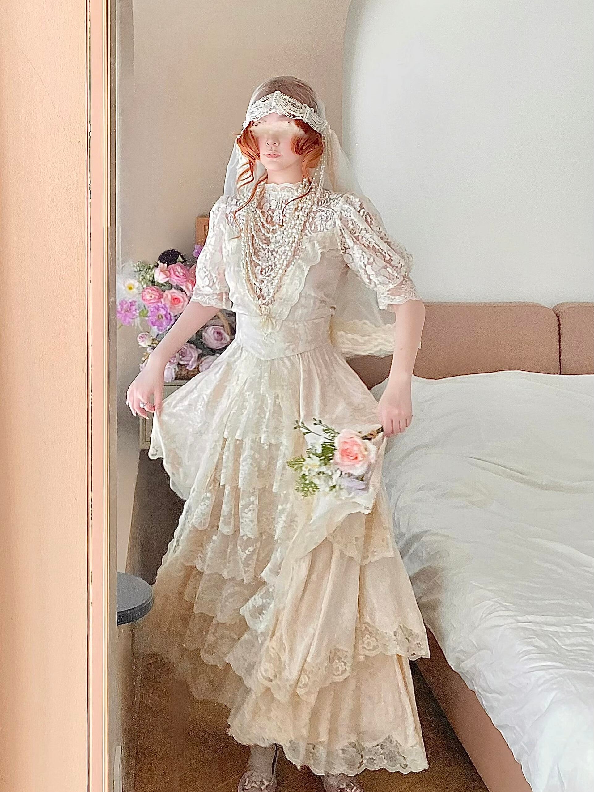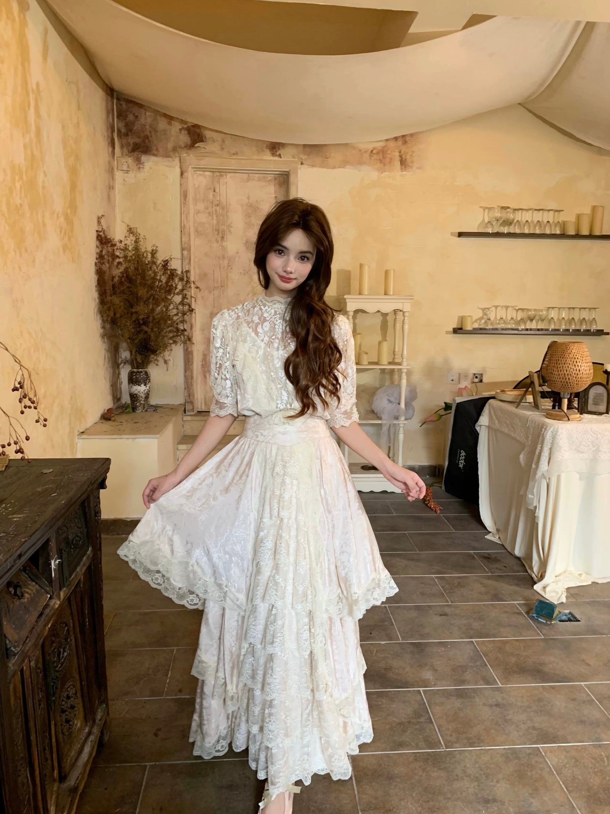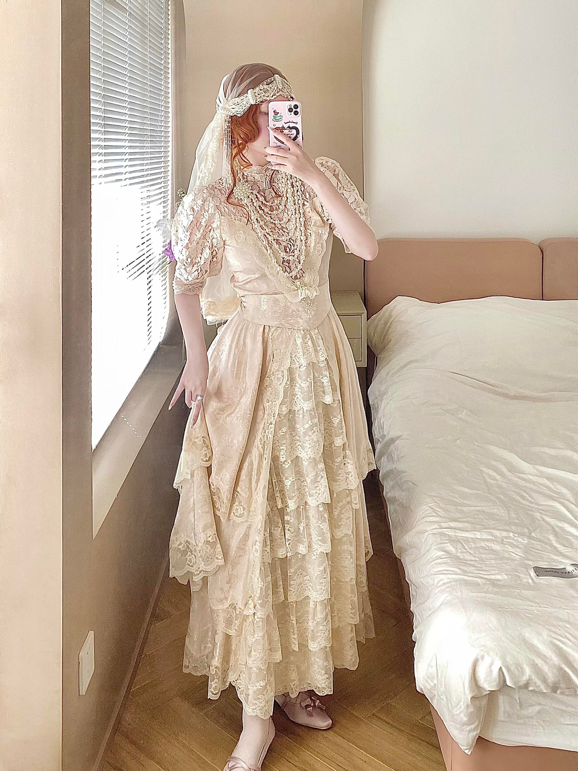 🌸 The hem is layered with multiple tiers of lace, giving it a graceful drape and a soft, comfortable flow. A matching belt is included to style the dress in different ways.