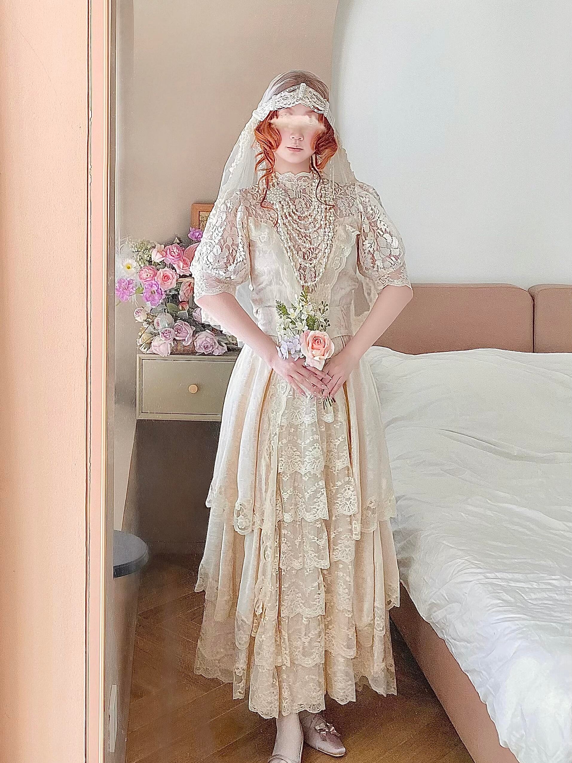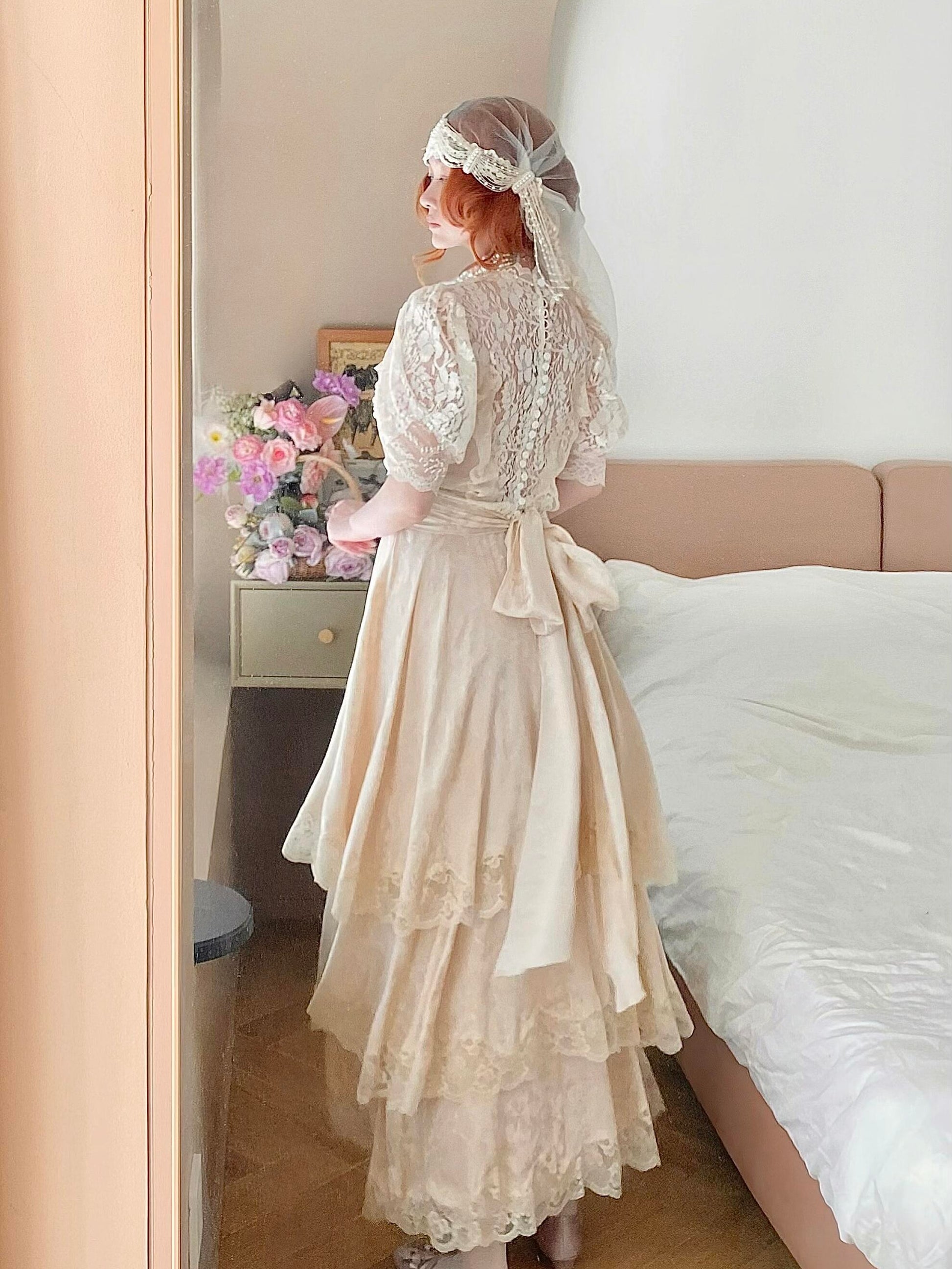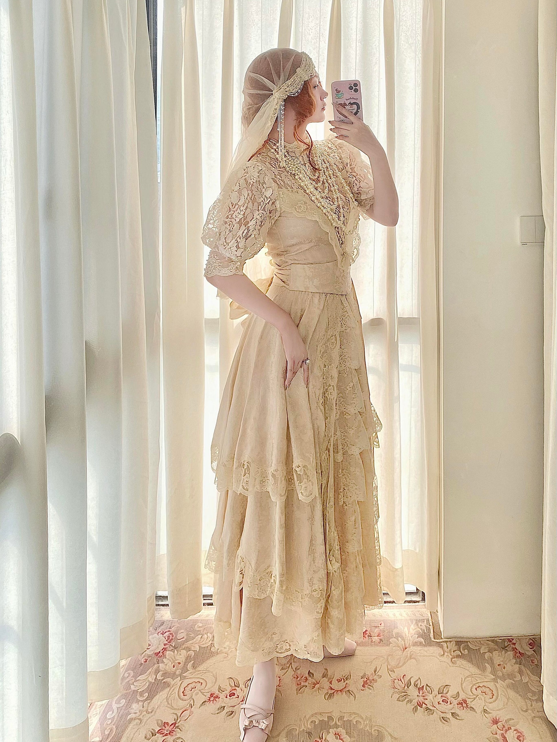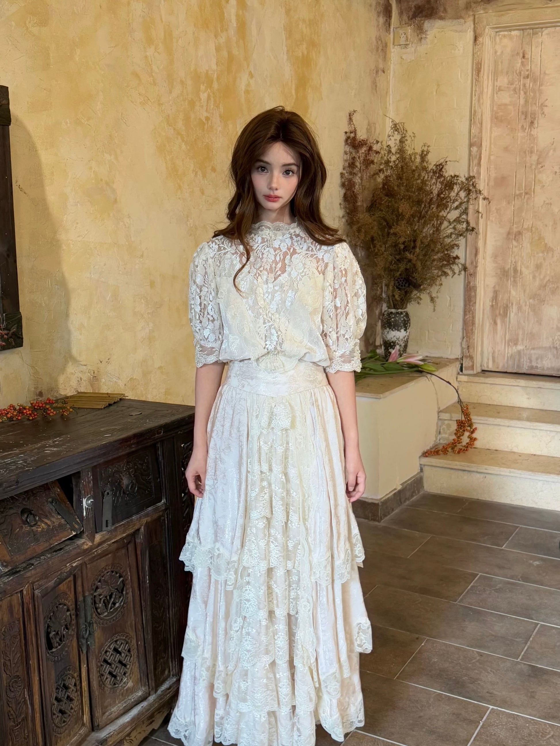 🌸 The hem is layered with multiple tiers of lace, giving it a graceful drape and a soft, comfortable flow. A matching belt is included to style the dress in different ways.