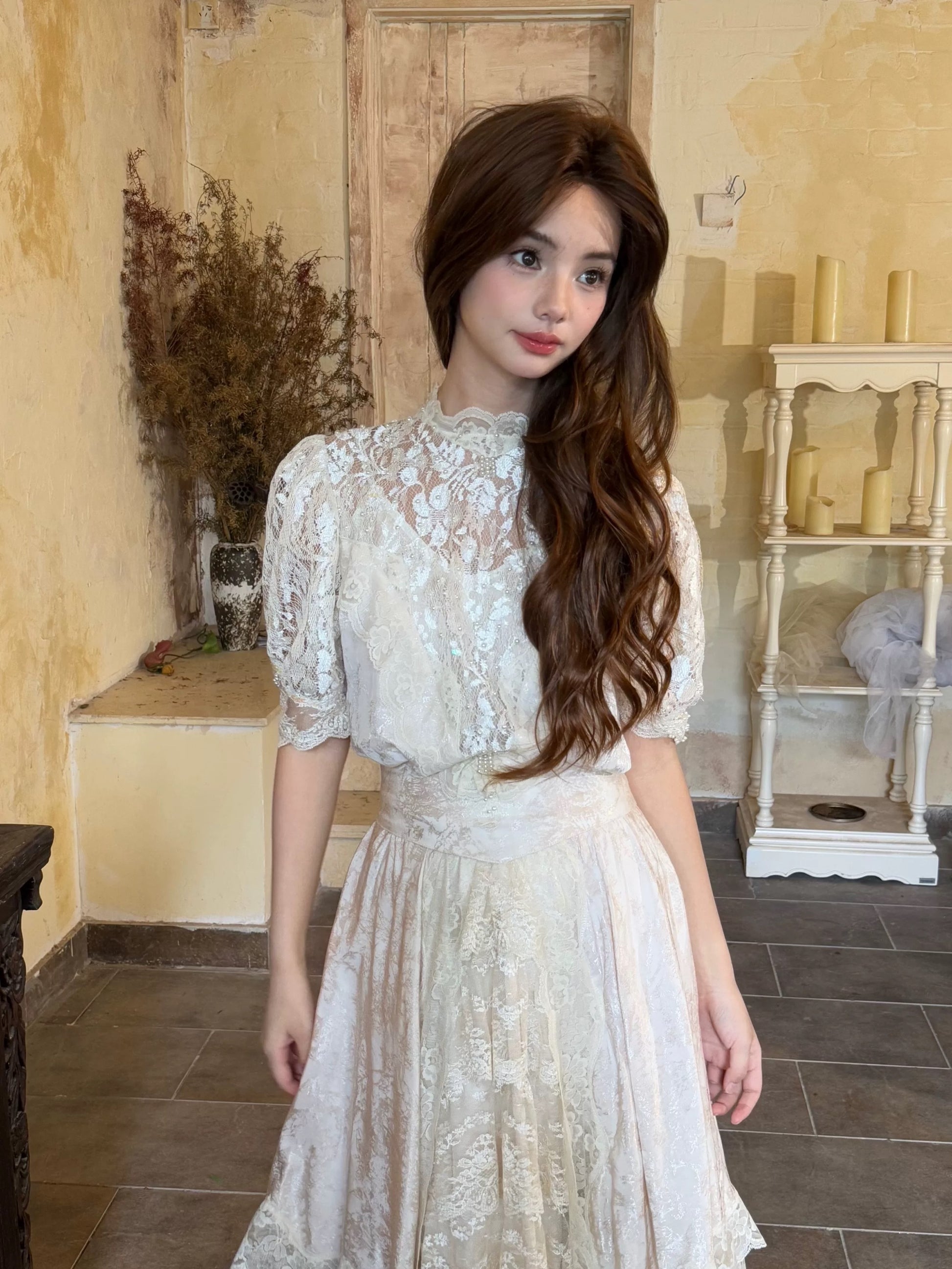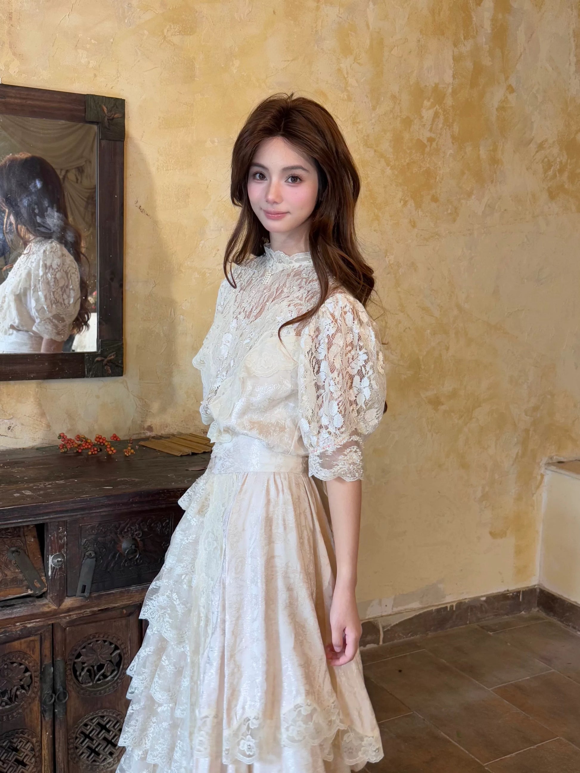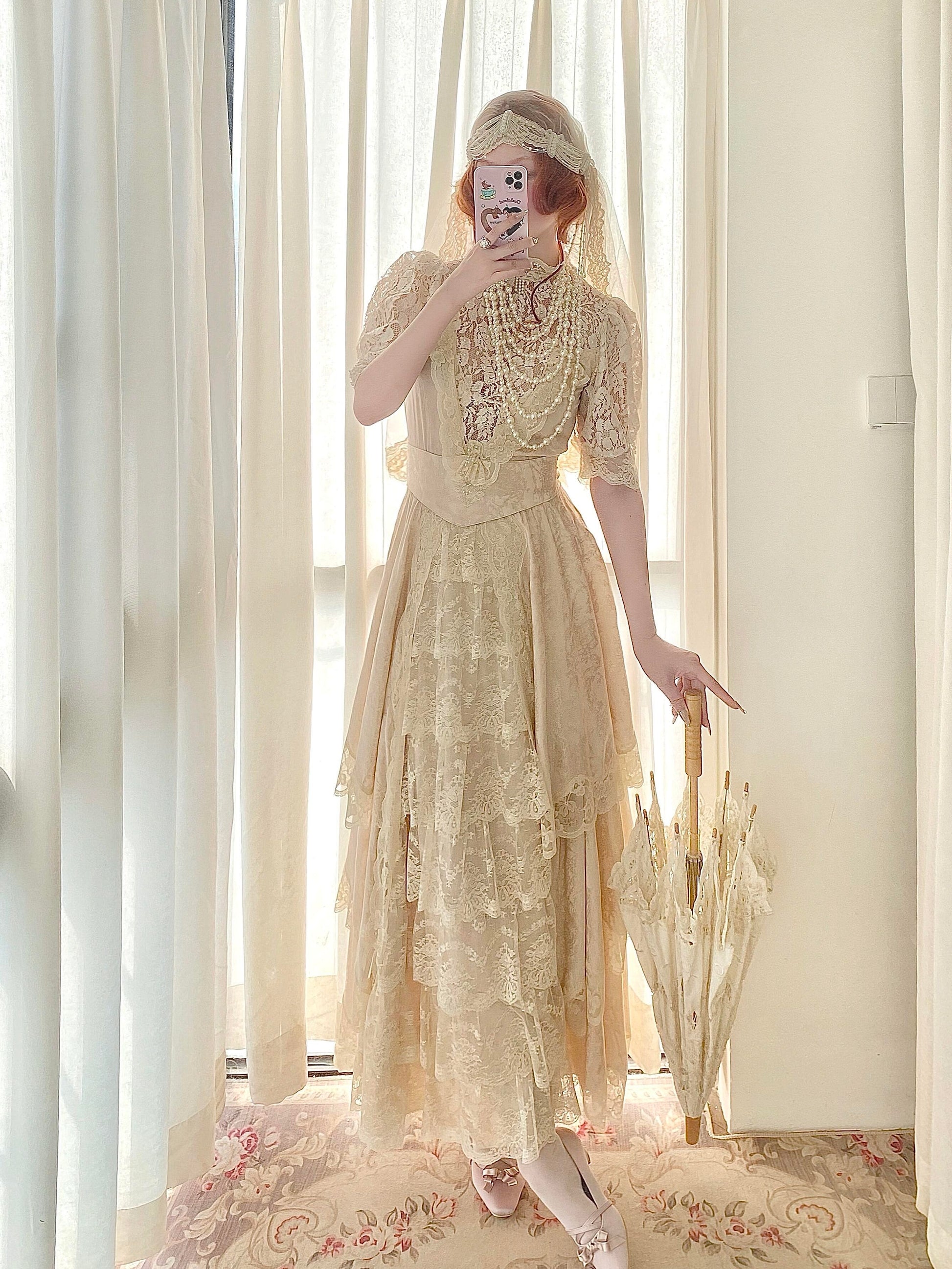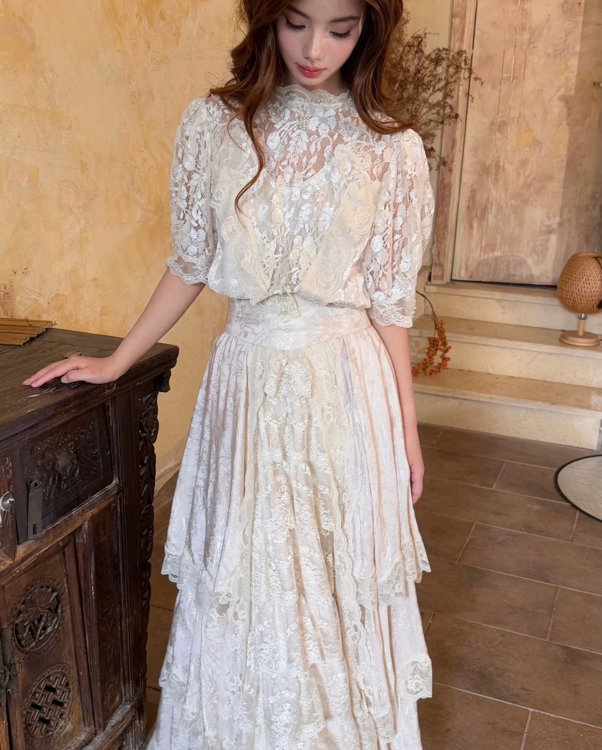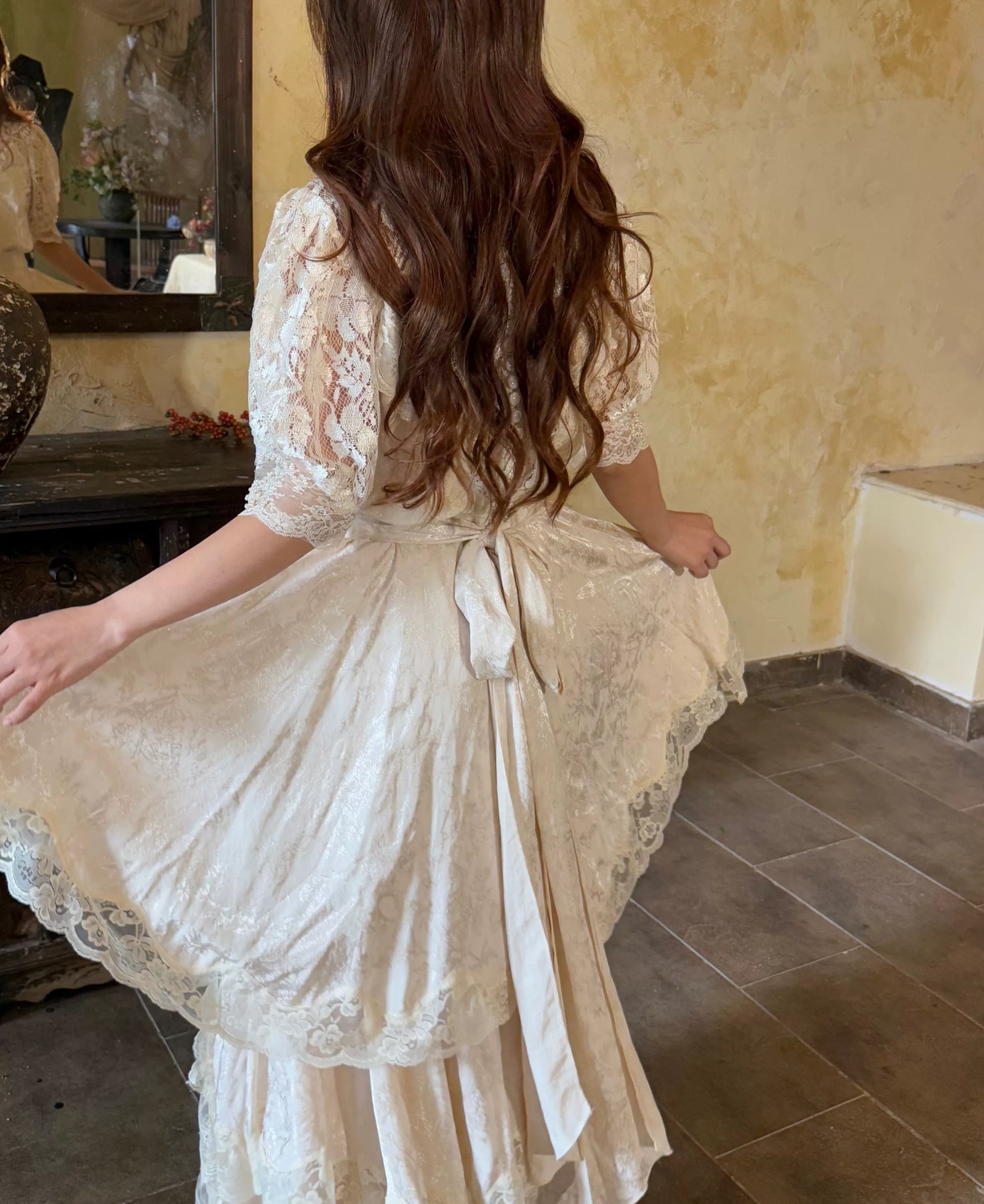 🌸 The hem is layered with multiple tiers of lace, giving it a graceful drape and a soft, comfortable flow. A matching belt is included to style the dress in different ways.