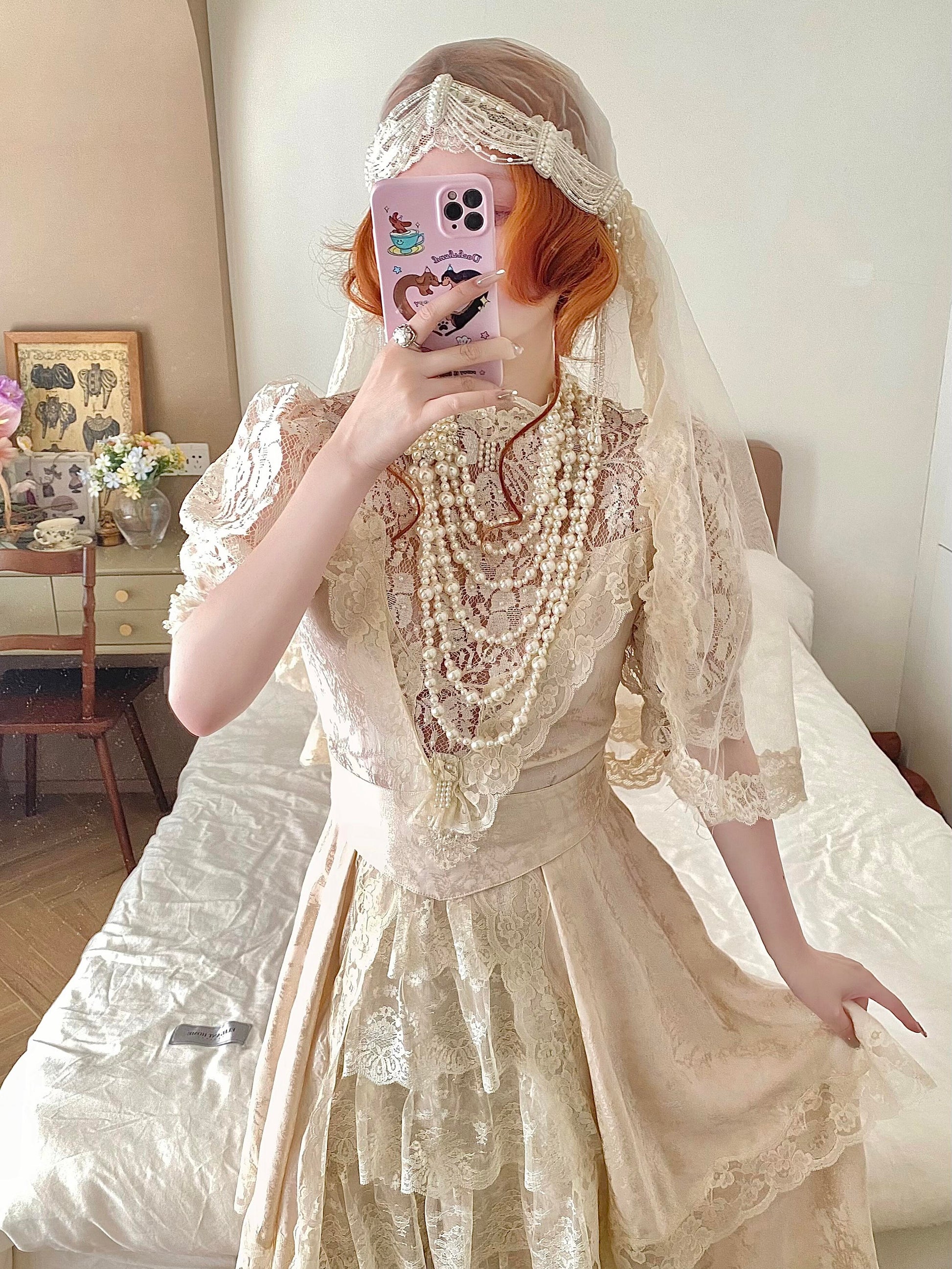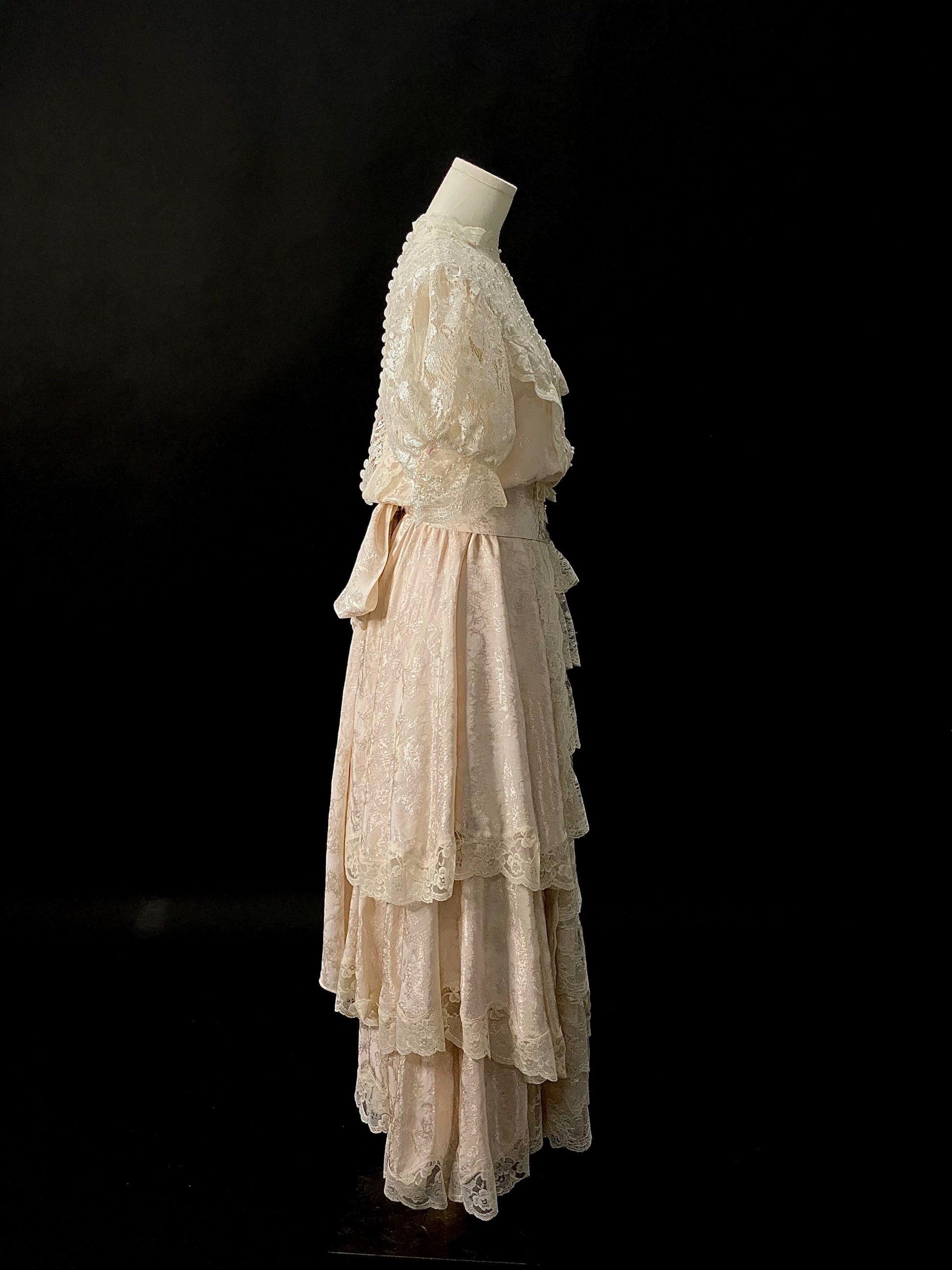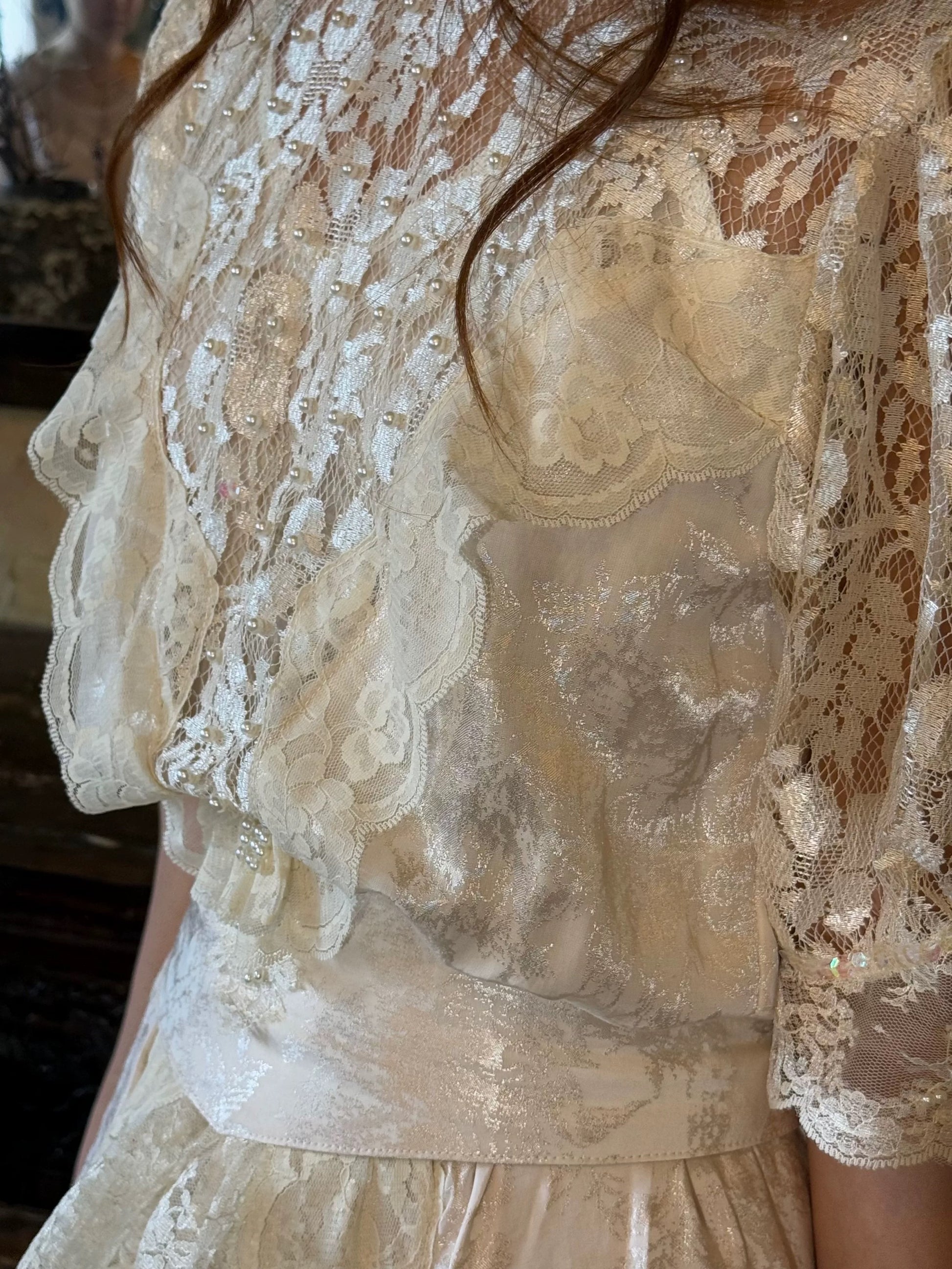 👗 Crafted from a custom eggshell pink jacquard silk blend, this dress features a shimmering lace panel at the front, delicately hand-embellished with pearls and sequins. The sleeves are made from the same elegant lace for a refined touch.