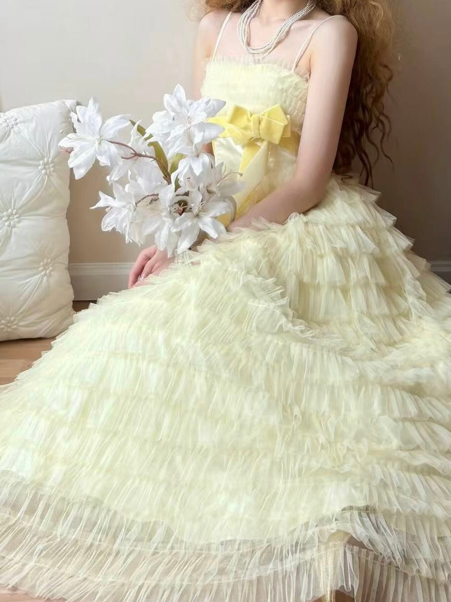 The chest is adorned with a detachable velvet bow in a beautiful buttery yellow.