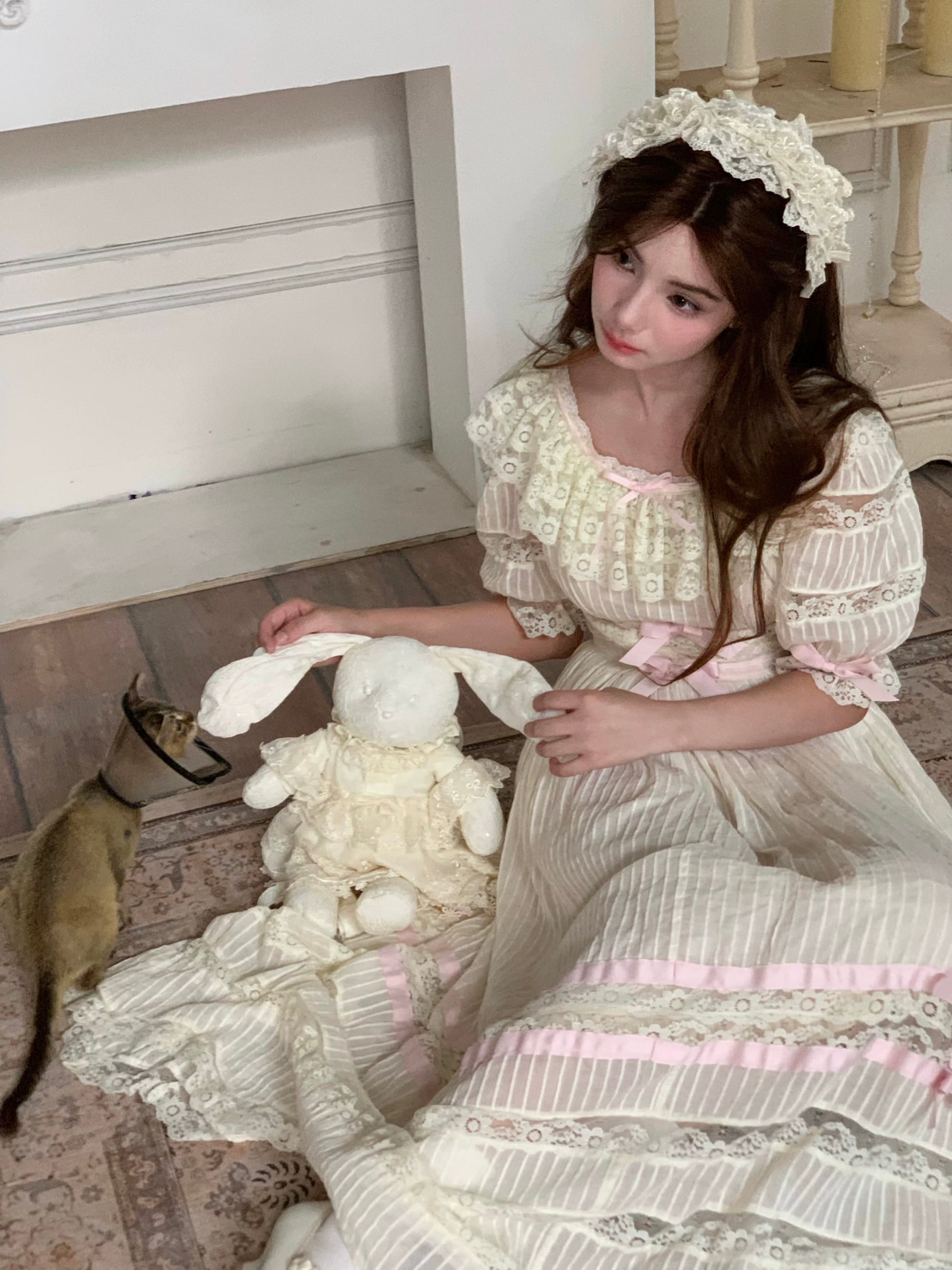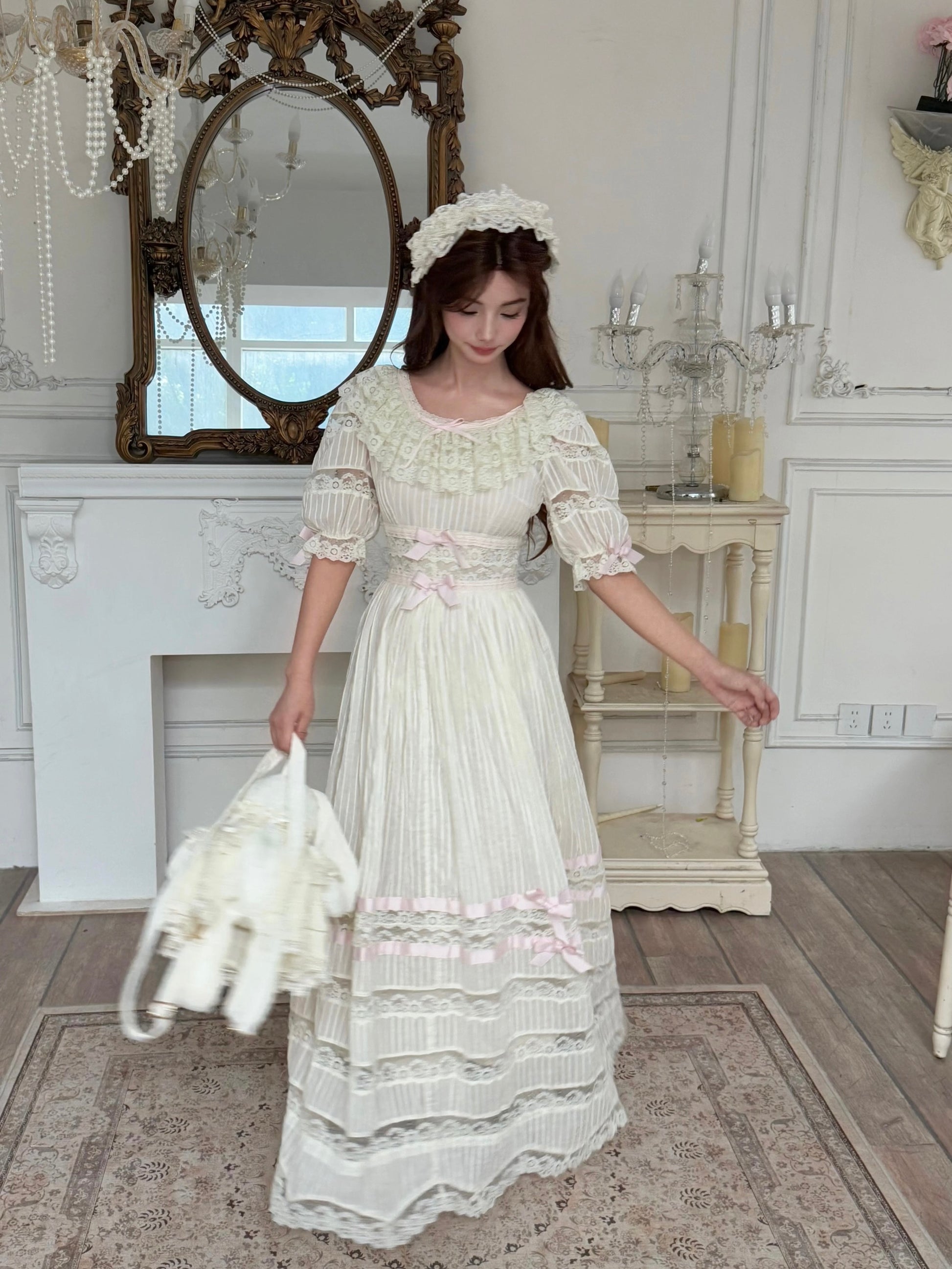 The dress is crafted entirely with tucked-pleat techniques, including the sleeves which require precise trimming, while the hem lace is carefully hand-positioned and hand-stitched, complemented by a removable bow detail.